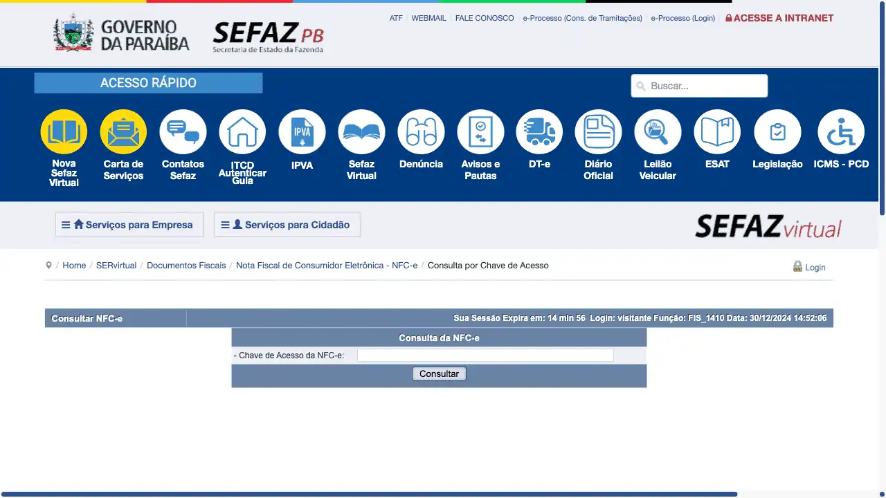 Consulta Nota Fiscal de Consumidor Eletrônica (NFC-e) na Secretaria da Fazenda (SEFAZ) do Estado da Paraíba (PB).