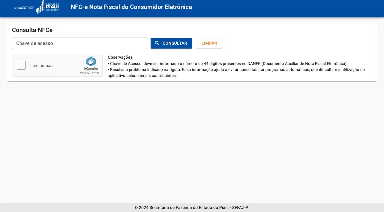 Consulta Nota Fiscal de Consumidor Eletrônica (NFC-e) na Secretaria da Fazenda (SEFAZ) do Estado do Piauí (PI).