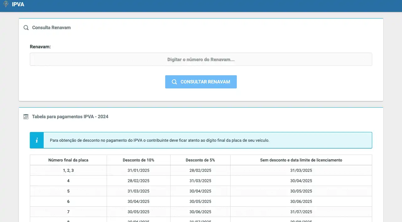 Pesquisa dados de Imposto sobre Propriedades de Veículos Automotores (IPVA), através do número de renavam.