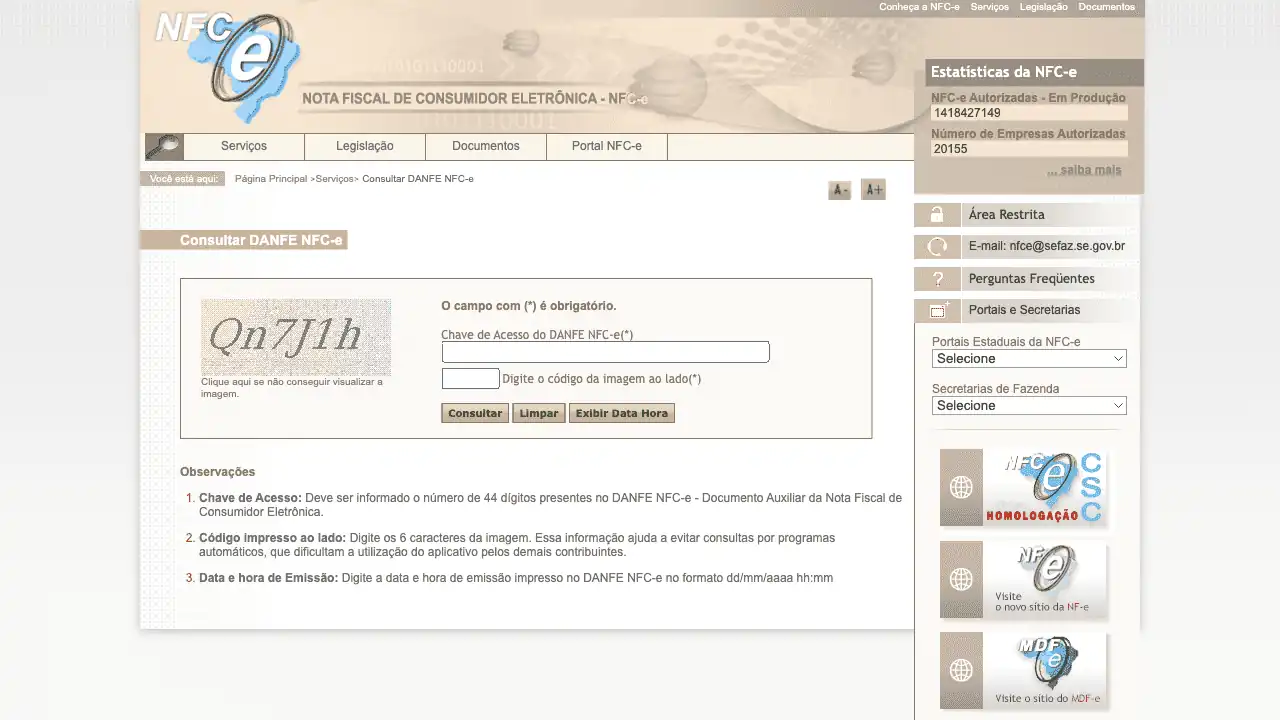 Consulta Nota Fiscal de Consumidor Eletrônica (NFC-e) na Secretaria da Fazenda (SEFAZ) do Estado de Sergipe (SE).
