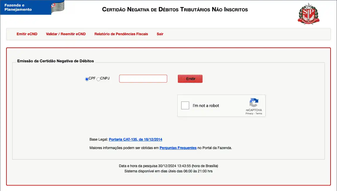Emite Certidão Negativa de Débitos Tributários Não Inscritos na SEFAZ SP.