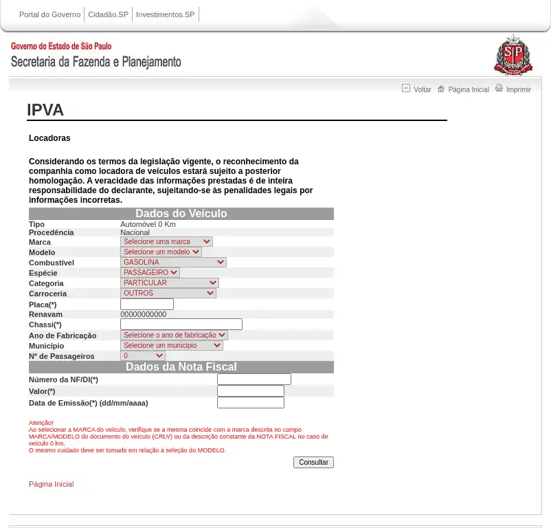 Pesquisa dados de Imposto sobre Propriedades de Veículos Automotores (IPVA), exclusivamente para veículos Zero KM.