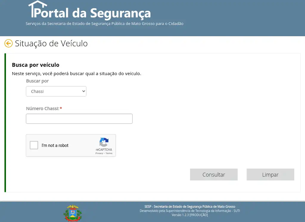 Consulta situação do veículo no Serviços da Secretaria de Estado de Segurança Pública (SESP) de Mato Grosso (MT), retornando dados básicos do veículo e situação de roubo ou furto.