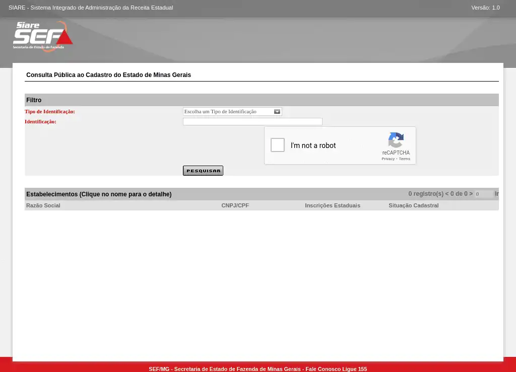 Consulta pública ao SINTEGRA (Sistema Integrado de Informações sobre Operações Interestaduais com Mercadorias e Serviços) do estado de Minas Gerais, que permite verificar a situação do cadastro junto à SEFAZ e o regime de tributação de ICMS.