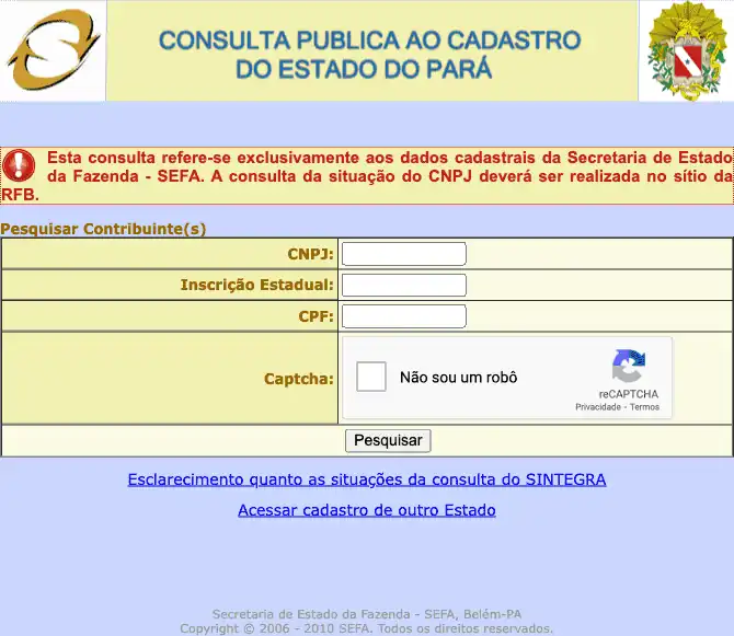 Consulta pública ao SINTEGRA (Sistema Integrado de Informações sobre Operações Interestaduais com Mercadorias e Serviços) do estado do Pará, que permite verificar a situação do cadastro junto à SEFAZ e o regime de tributação de ICMS.