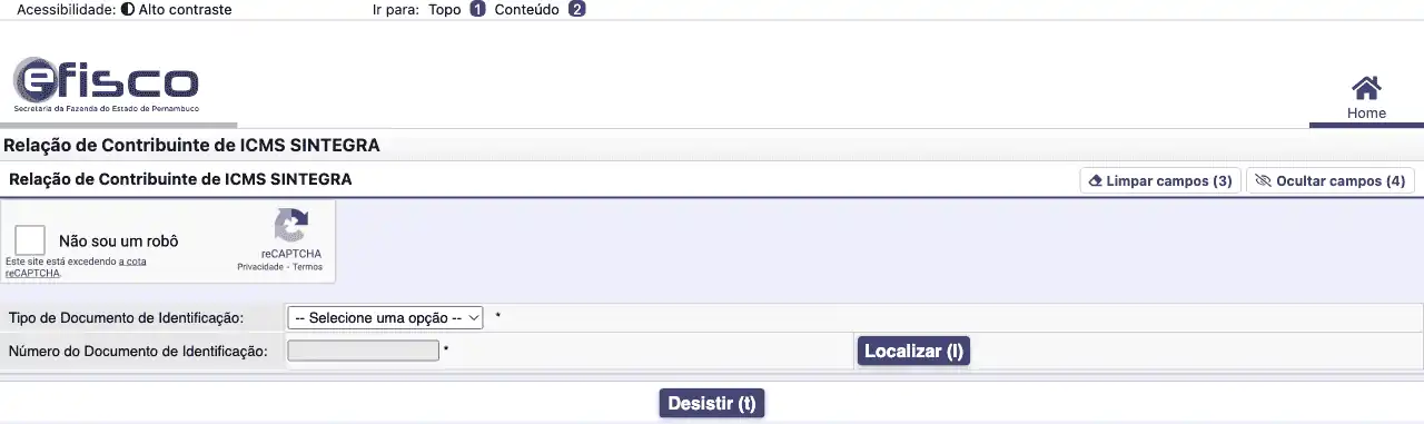 Consulta pública ao SINTEGRA (Sistema Integrado de Informações sobre Operações Interestaduais com Mercadorias e Serviços) do estado de Pernambuco, que permite verificar a situação do cadastro junto à SEFAZ e o regime de tributação de ICMS.
