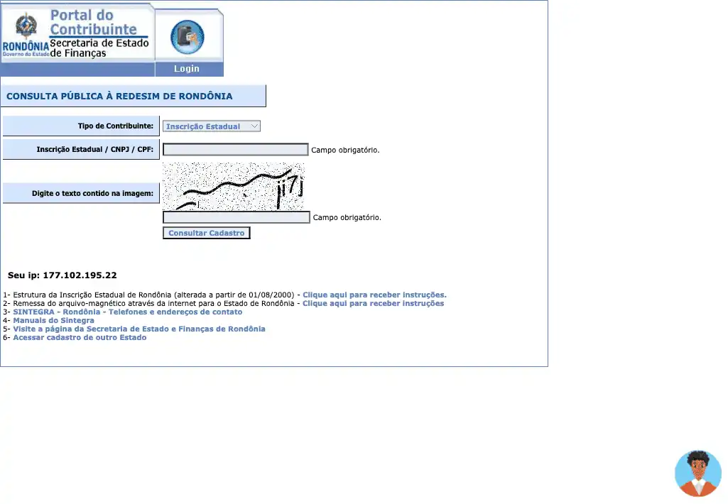 Consulta pública ao SINTEGRA (Sistema Integrado de Informações sobre Operações Interestaduais com Mercadorias e Serviços) do estado de Rondônia, que permite verificar a situação do cadastro junto à SEFAZ e o regime de tributação de ICMS.