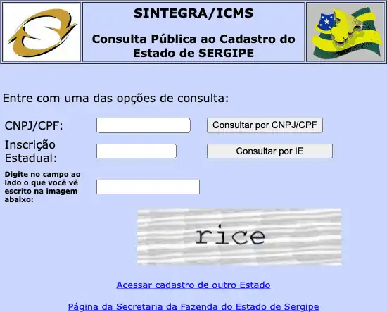 Consulta pública ao SINTEGRA (Sistema Integrado de Informações sobre Operações Interestaduais com Mercadorias e Serviços) do estado de Sergipe, que permite verificar a situação do cadastro junto à SEFAZ e o regime de tributação de ICMS.