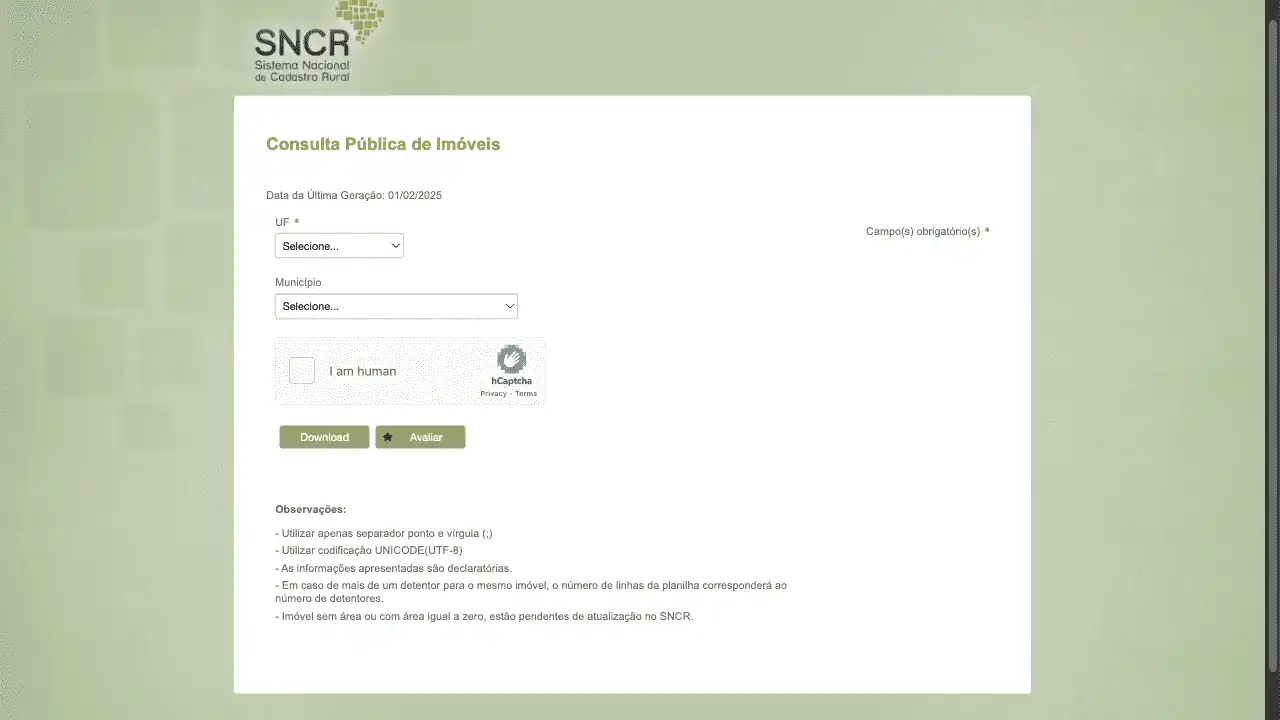 Realiza uma Consulta Pública de Imóveis no Sistema Nacional de Cadastro Rural (SNCR).
