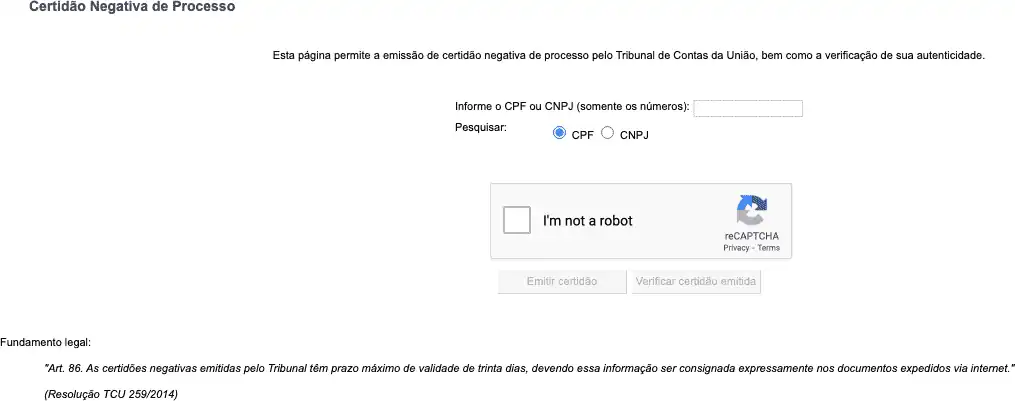 Verifica por meio do CPF ou CNPJ informado se a parte figura como responsável ou interessada em processos no Tribunal de Contas da União (TCU).