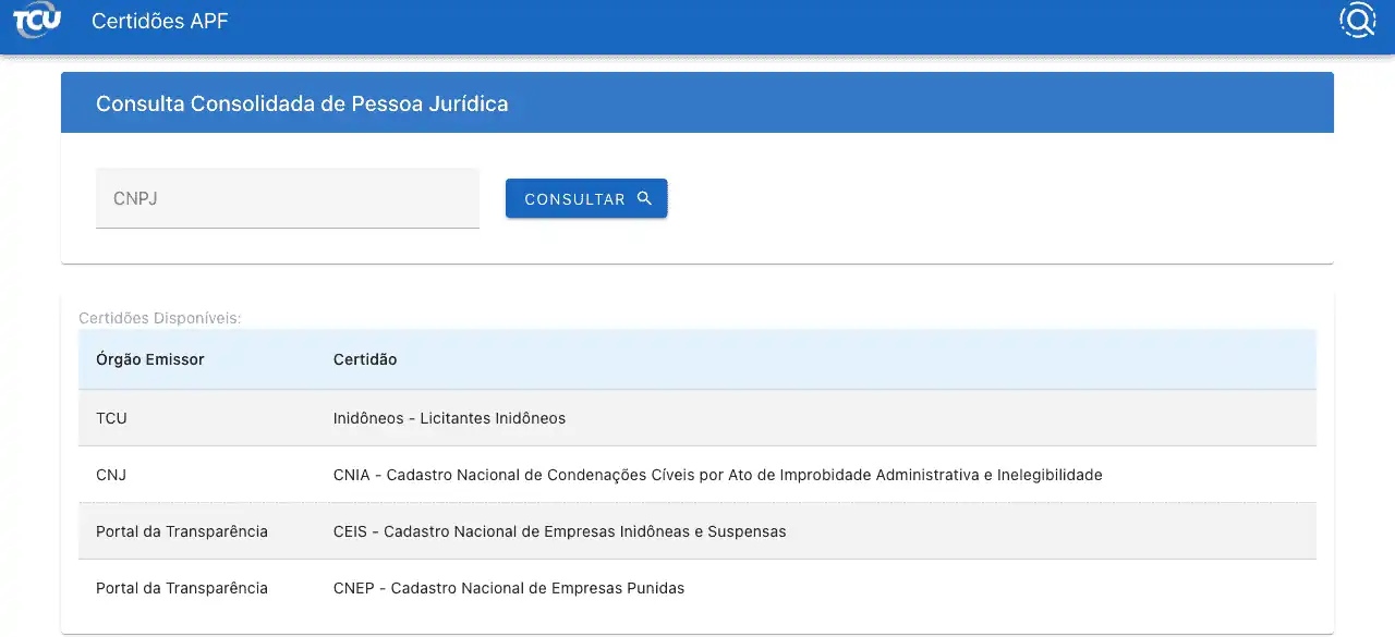 Conheça abaixo o web service (JSON) para consultar TCU / Consulta Consolidada de Pessoa Jurídica (APF).