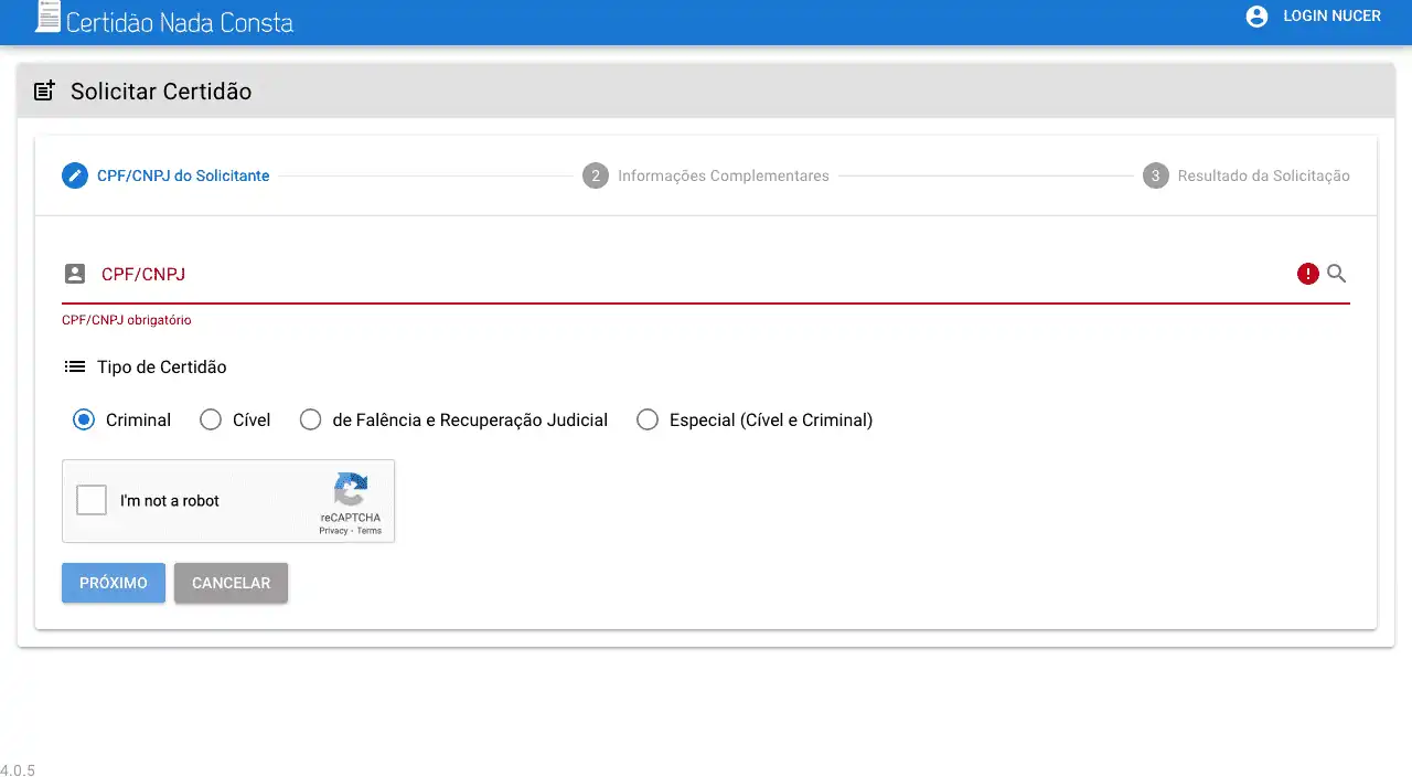 Emite uma certidão nada consta relacionada ao CPF informado usando o nome do pai e da mãe.