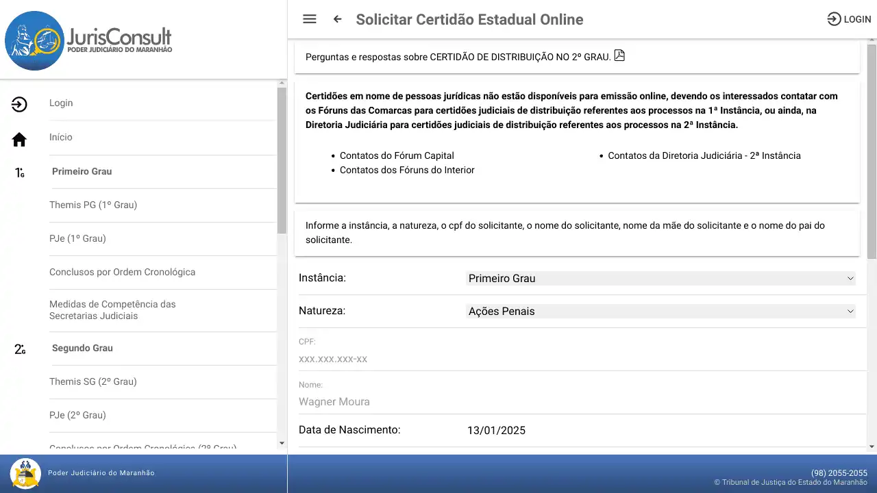 Emite certidão de 1º e 2º grau no Tribunal de Justiça do Estado do Maranhão.