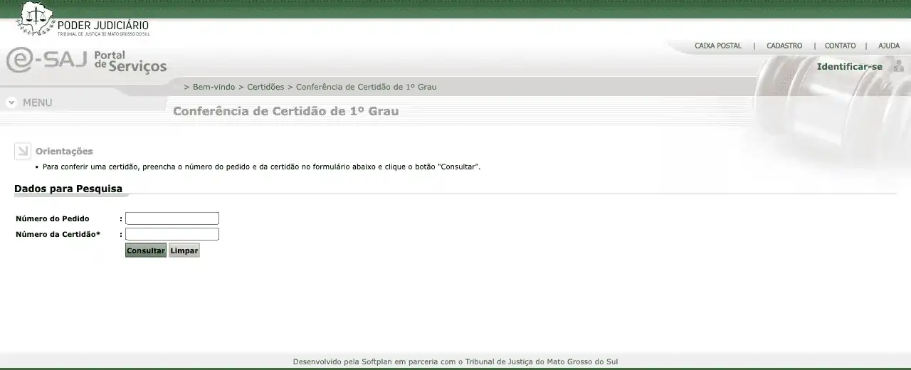 Realiza a emissão de uma Certidão de 1º grau, que foi anteriormente solicitada, no Tribunal de Justiça do Mato Grosso do Sul (TJMS).