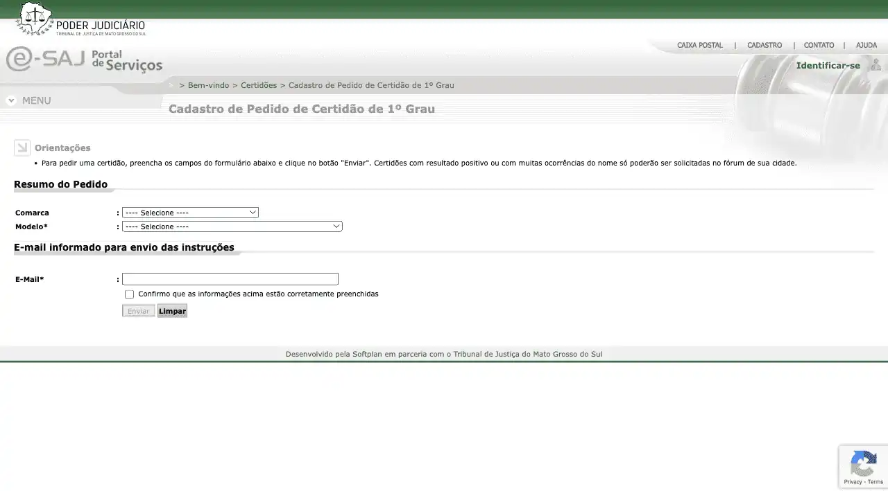 Realiza o cadastro de um Pedido de Certidão de 1º grau no Tribunal de Justiça do Mato Grosso do Sul (TJMS).