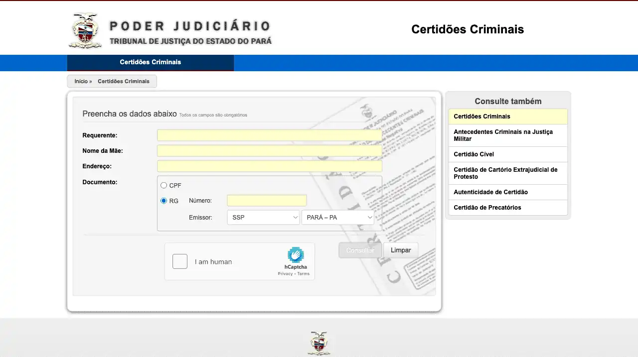 Emite certidão criminal para pessoas físicas no âmbito do Tribunal de Justiça do Pará.