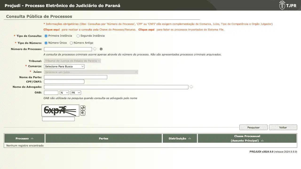 Consulta a situação de processos no TJPR (Tribunal de Justiça do Estado do Paraná) através dos dados fornecidos.