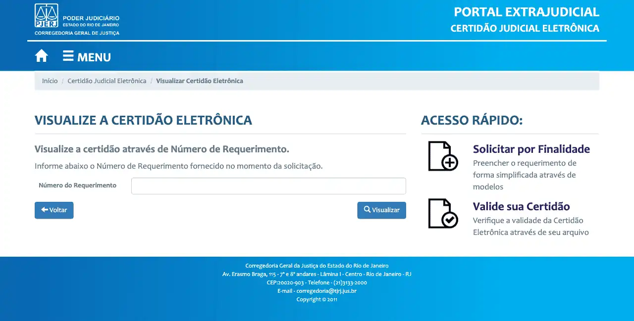 Pode ser usada para buscar uma certidão no Tribunal de Justiça do Estado do Rio de Janeiro (TJRJ) pelo número de requerimento
