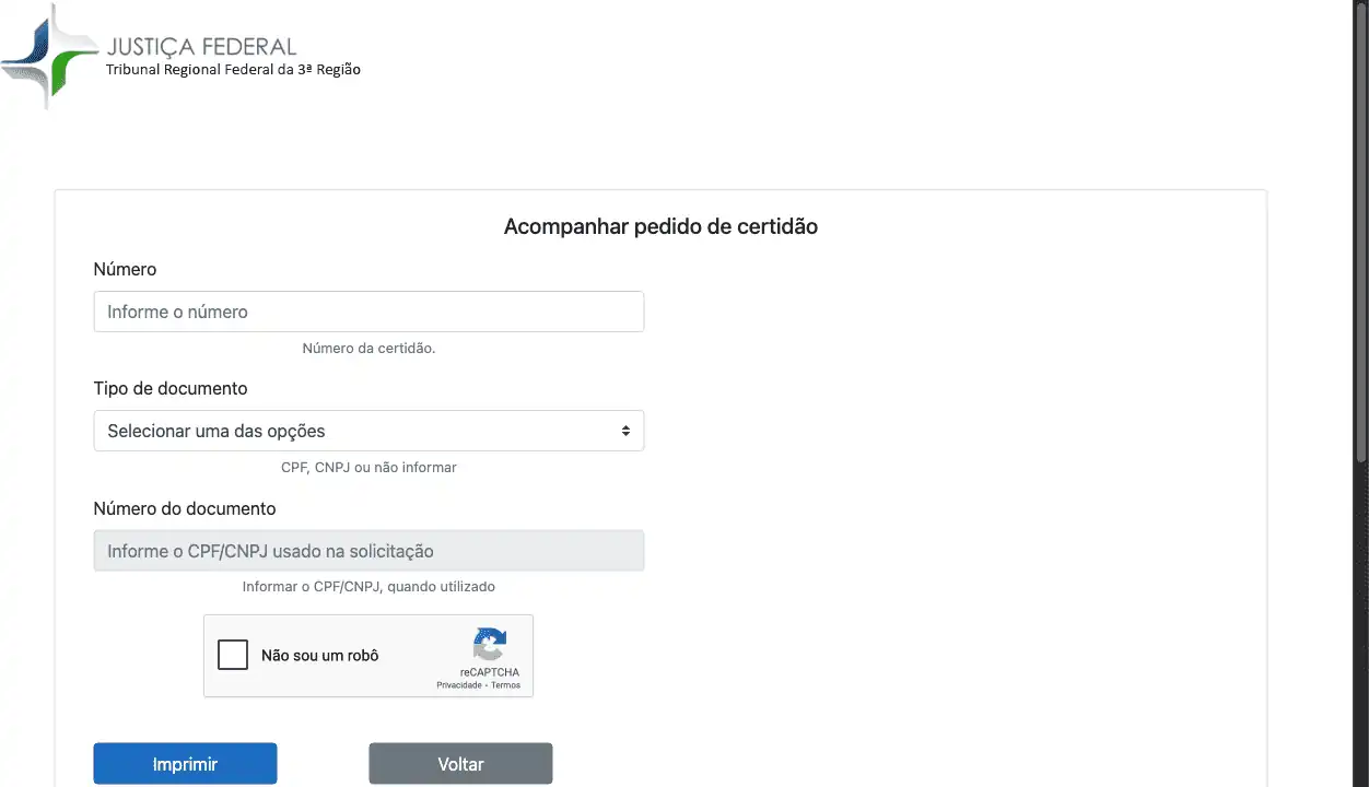 Realiza o download de uma certidão de distribuição no portal do Tribunal Regional Federal da 3ª Região (TRF3), por meio do número da certidão e documento.