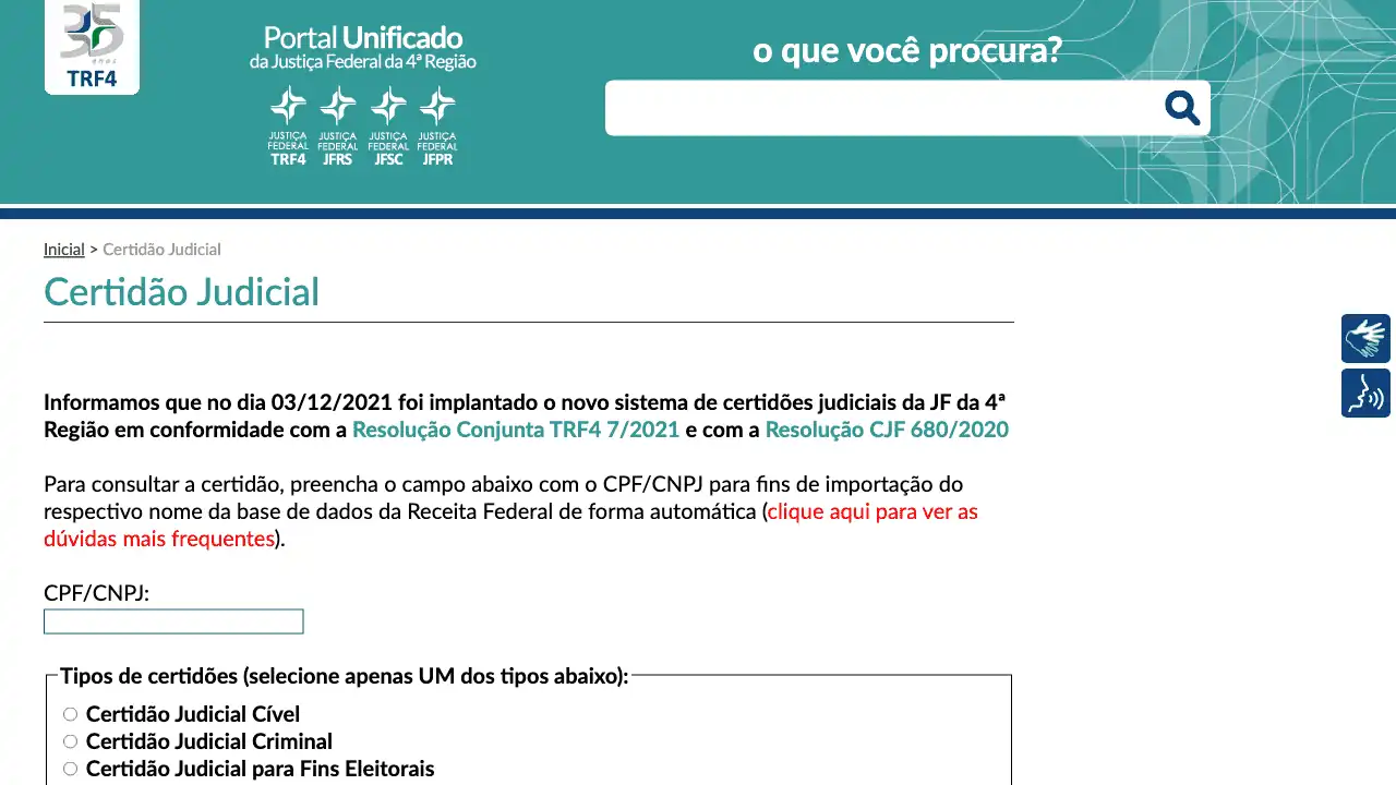 Emite certidão negativa cível e criminal no portal do Tribunal Regional Federal da 4ª Região (RS, SC e PR), TRF4.