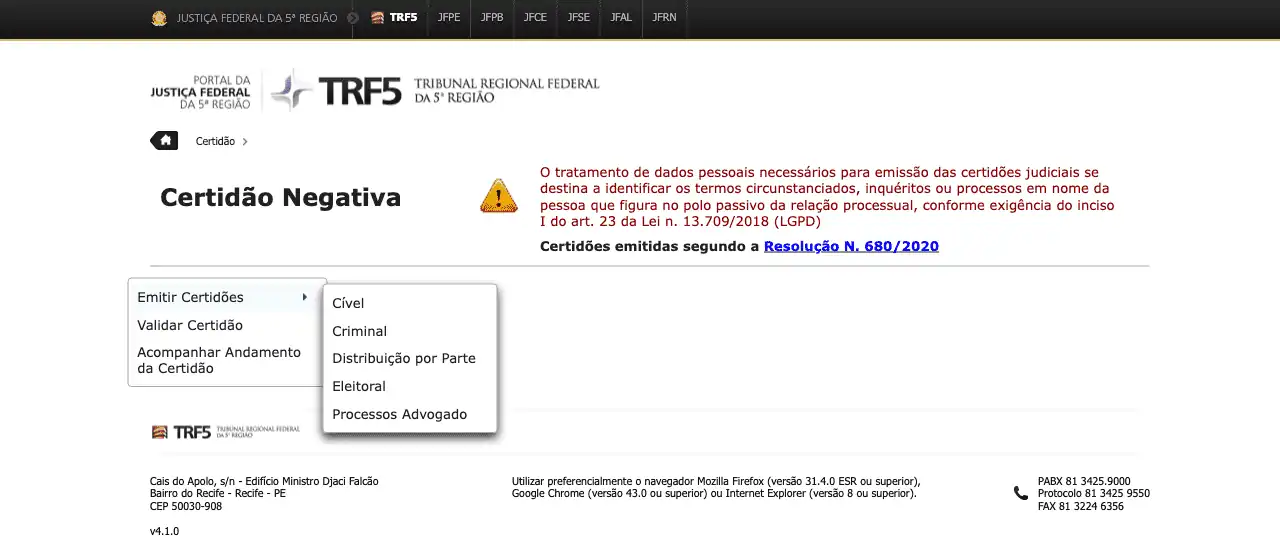 Emite certidão negativa cível e criminal no portal do Tribunal Regional Federal da 5ª Região (Alagoas, Ceará, Paraíba, Pernambuco, Rio Grande do Norte, e Sergipe), TRF5.