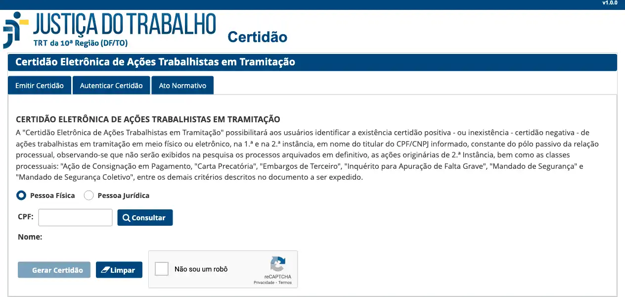 Consulta se uma pessoa física ou jurídica tem ações trabalhistas no TRT10.
