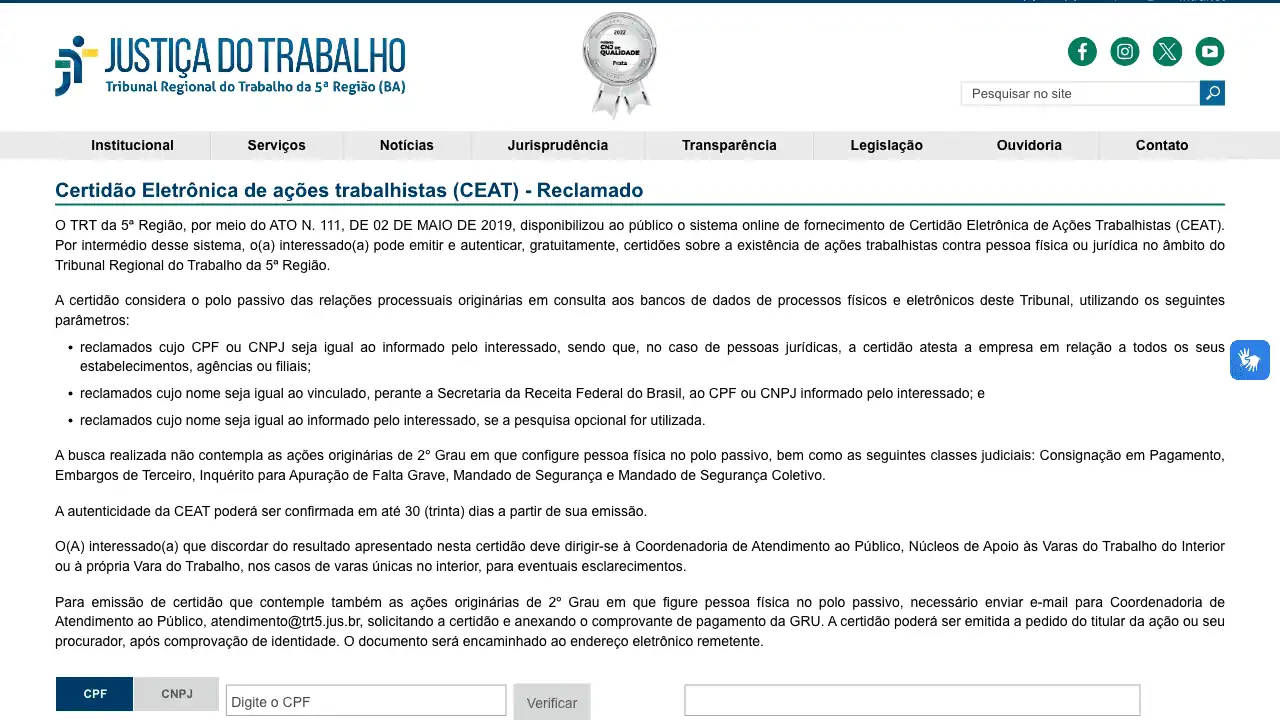 Consulta se uma pessoa física ou jurídica tem ações trabalhistas no TRT5.